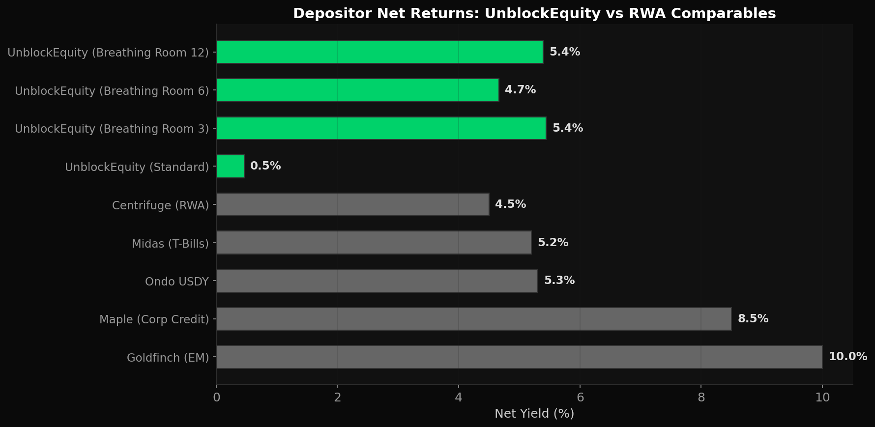 Key finding: Of the 24 product combinations, 23 are viable (net yield >2%). The best combo (Standard + Breathing Room 3 + FC) delivers 7.50% net yield. The 3-axis architecture lets curators select exactly the risk-return profile they want.